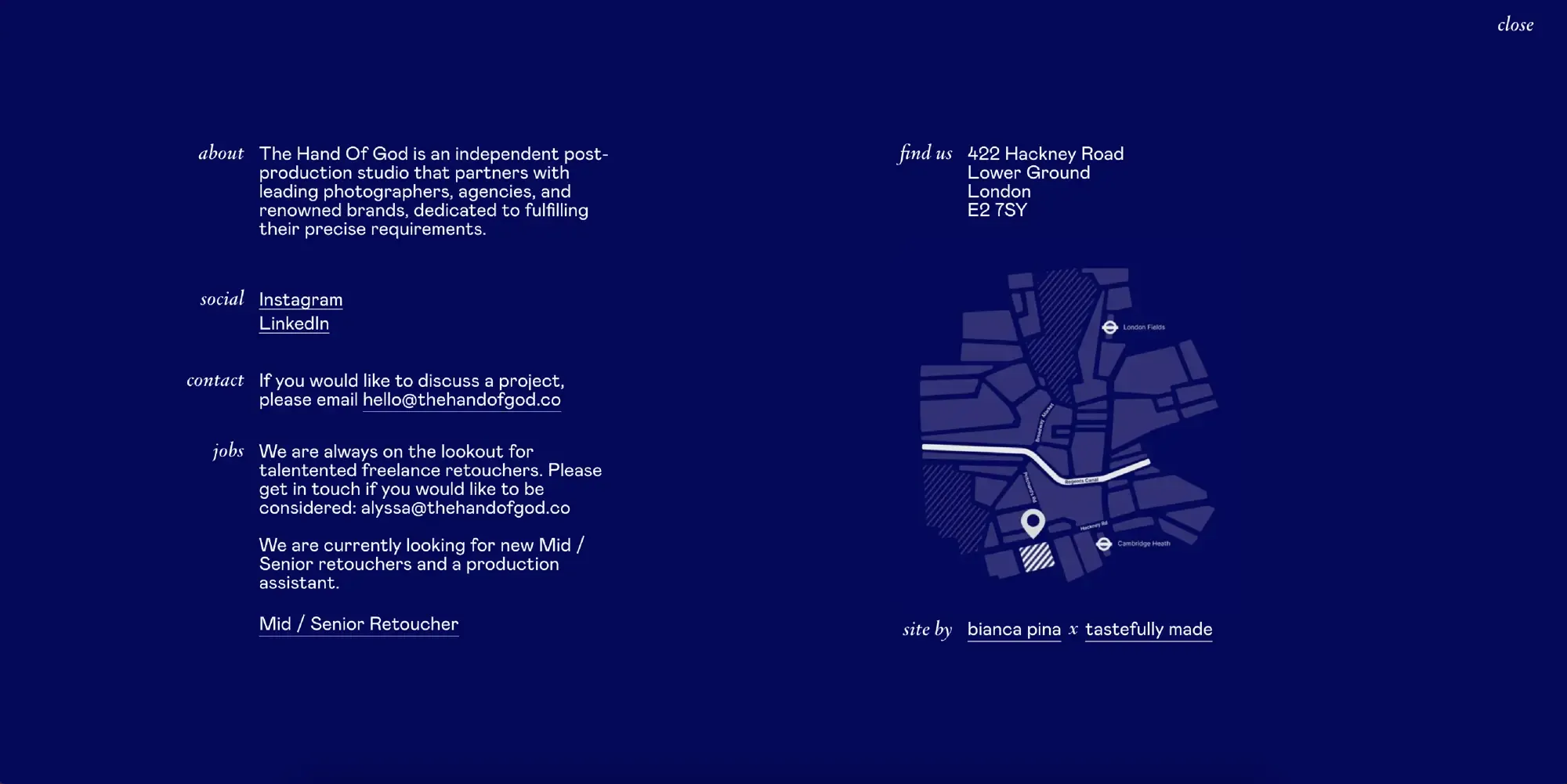The Hand of God, an independent post-production studio, has undergone a stunning website redesign that incorporates the elegant Galien font. The Hand of God collaborates with top photographers, agencies, and renowned brands. They specialize in fulfilling precise visual requirements for their clients, ensuring high-quality results in various projects including editorial, campaign, fashion, sport, and lifestyle sectors. Their redesign, crafted by Bianca Pina in collaboration with Tastefully Made, leverages the distinctive characteristics of Galien to enhance the site’s visual appeal and functionality.