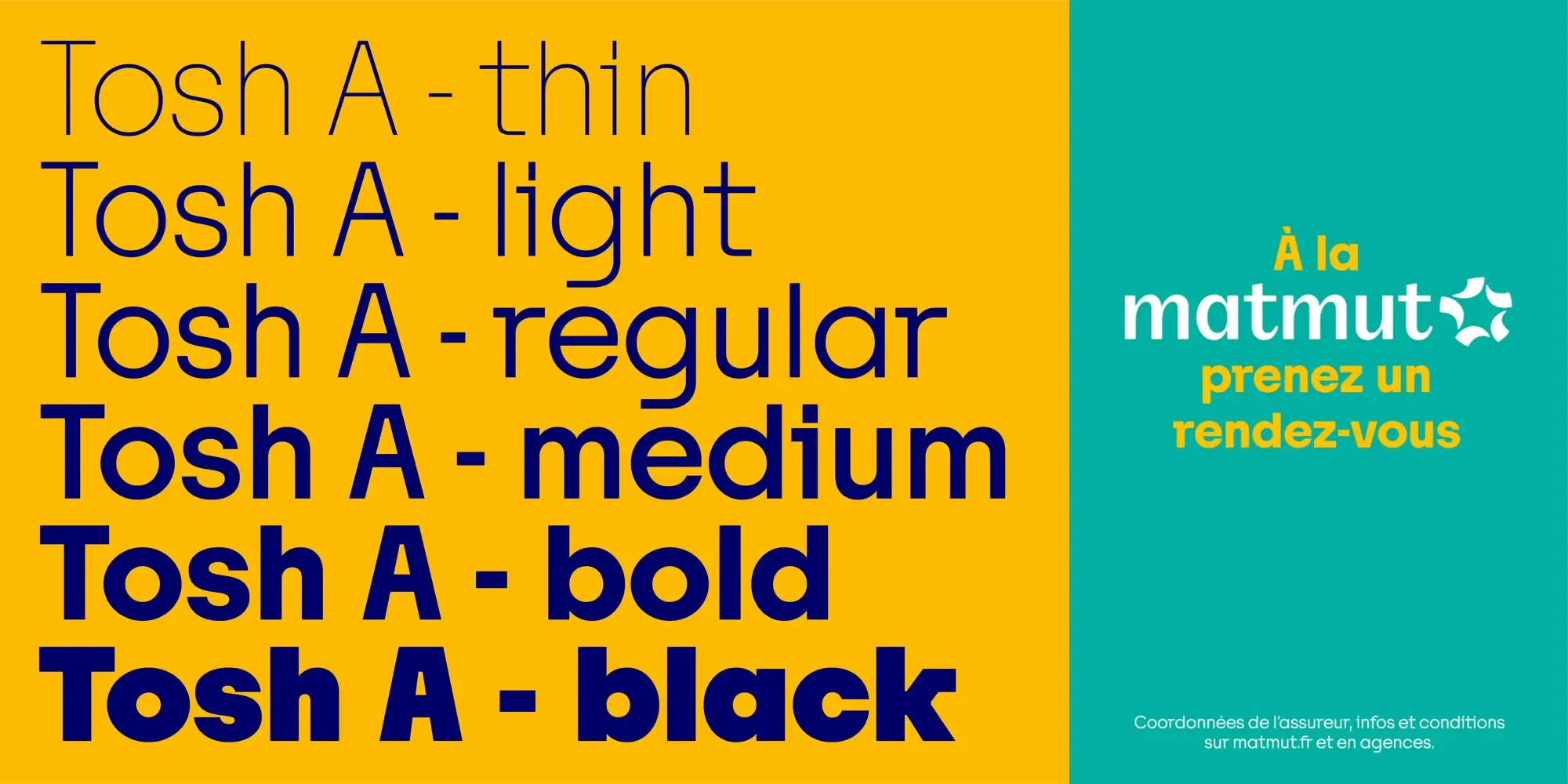 Versatility in Communication: Although Tosh A is not used in Matmut’s logo, it plays a pivotal role in their advertising, headlines, and short paragraphs. The font’s versatility allows it to enhance various communication materials, ensuring that the brand’s messages are delivered clearly and effectively.